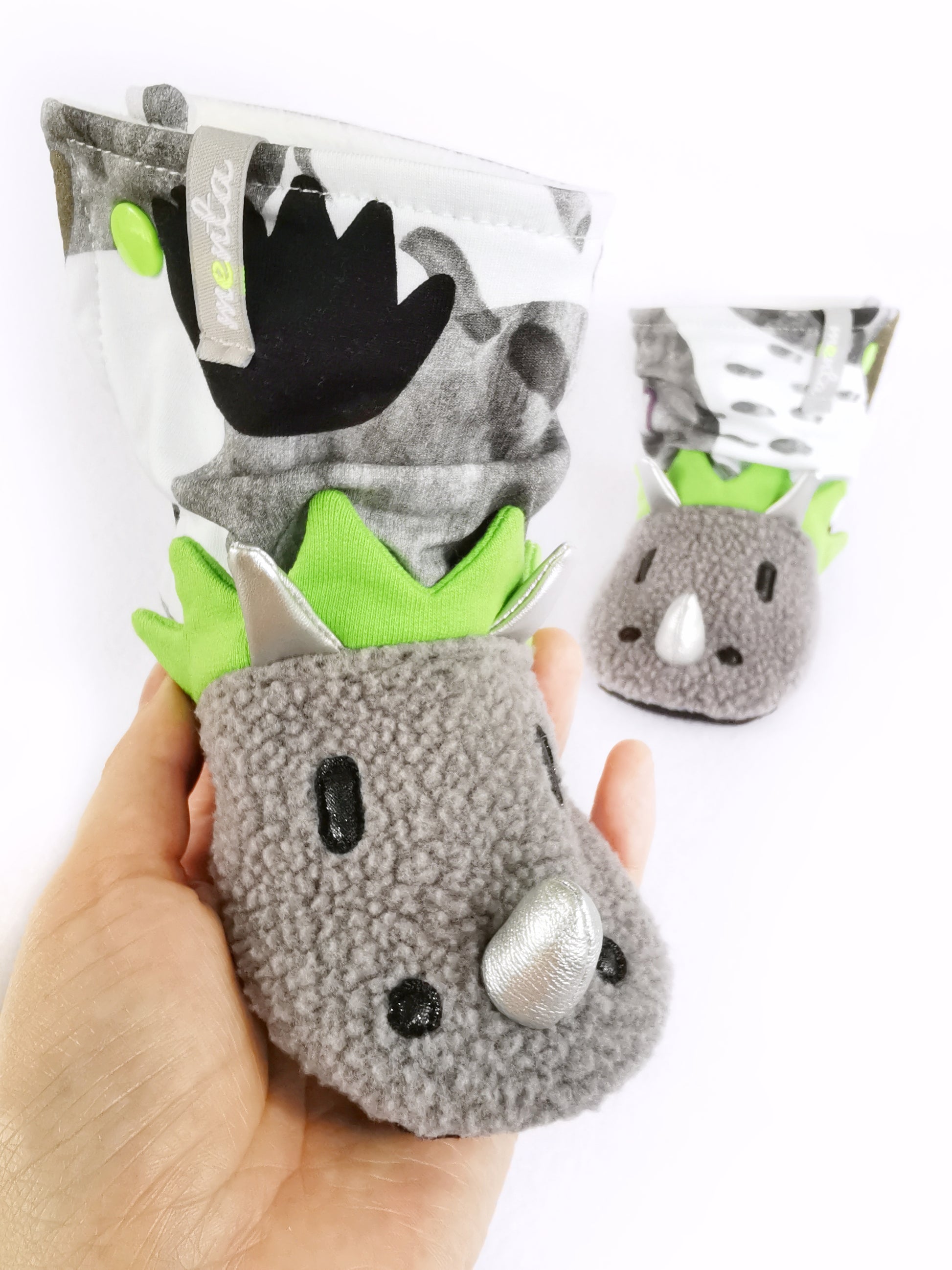 This listing is for a PDF file with instructions and pattern pieces to make your own Triceratops booties. This is not an actual pair of booties.