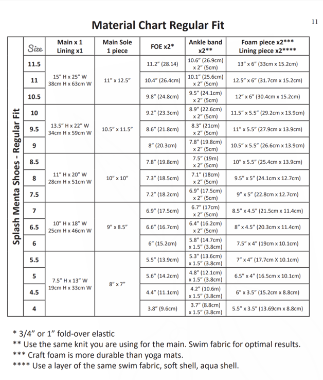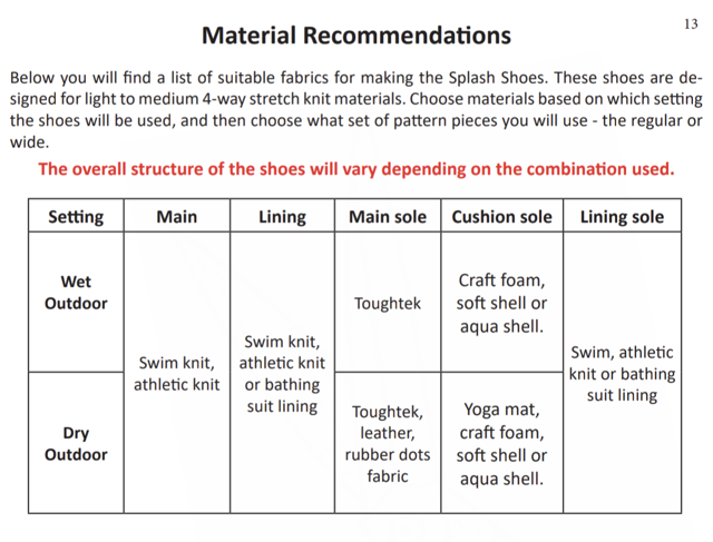 For optimal results, it is recommended to use swim or athletic knit for the main and lining pieces and Toughtek for the soles when sewing for wet outdoor settings.